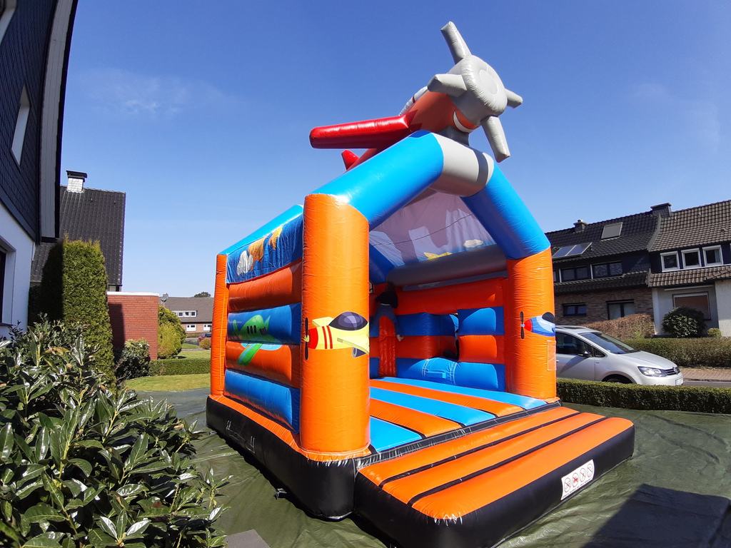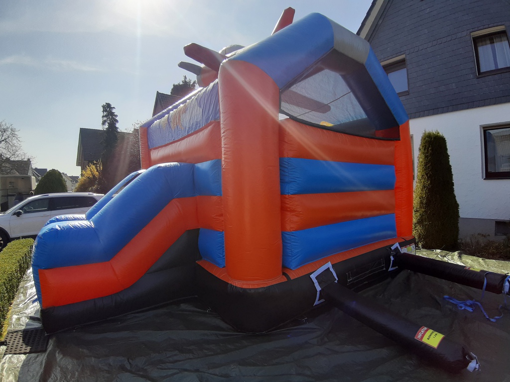 Die Hüpfburg Flugzeug mit Rutsche hat die Maße (L*B*H) (5m*6m*4m). Sie ist brandneu bei uns im Sortiment. Neben der großen Hüpffläche hat sie ein festes Dach und kleine Rutsche seitlich integriert.