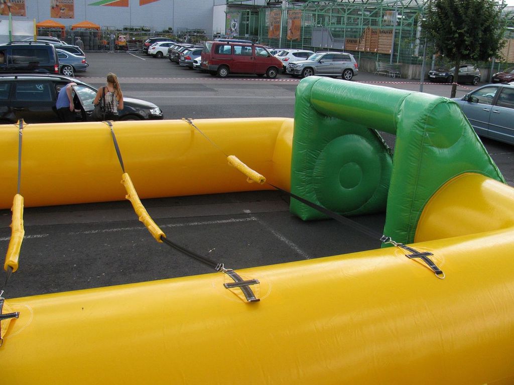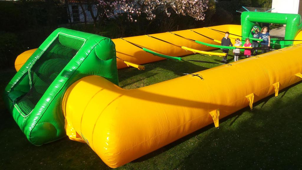 Im 11 x 7 x 2 (L x B x H) - Meter - Spielfeld können zehn Spieler gleichzeitig gegeneinander antreten (5 Spieler pro Mannschaft). Das Spiel funktioniert ähnlich wie Tischfussball, nur mit echten Spielern. Die einzelnen Spieler lassen während des Spiel ihre Hände an den jeweiligen Handschlaufen. Dabei können sich Spieler, die mit anderen Mitspielern in einer Reihe spielen, nur gemeinsam nach links oder rechts bewegen Ein riesiger Spaß und ein ideales Team-Spiel für jedes Firmen-, Straßen oder Vereinsfest. Es ist ebenfalls möglich, den Menschenkicker ohne Gurte als riesiges Spielfeld incl. Tore zu verwenden.