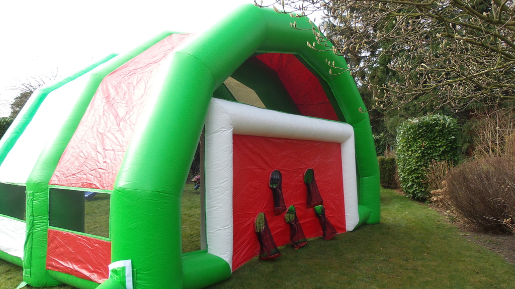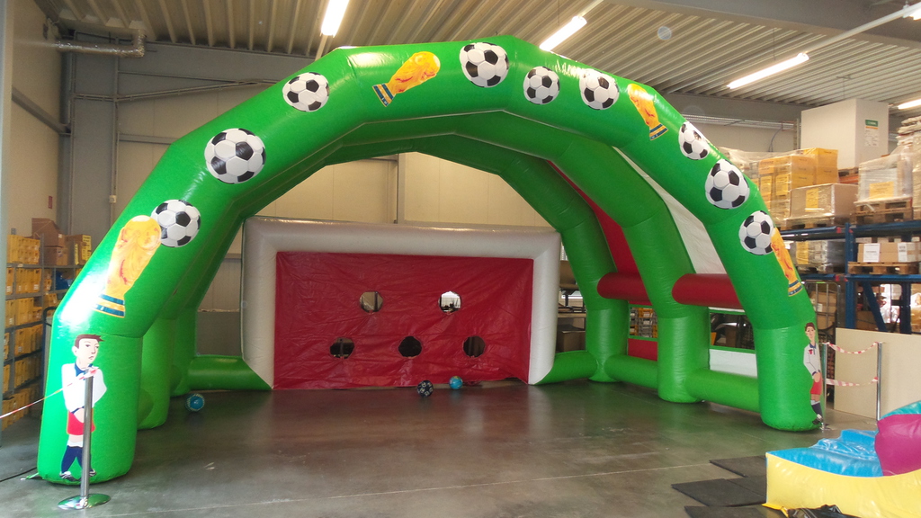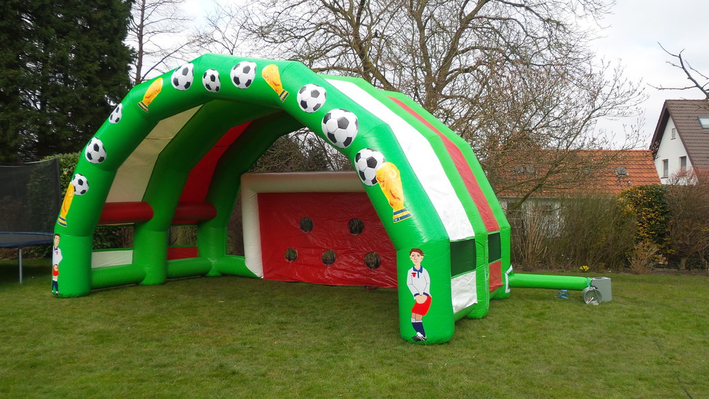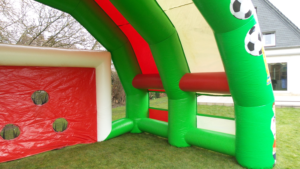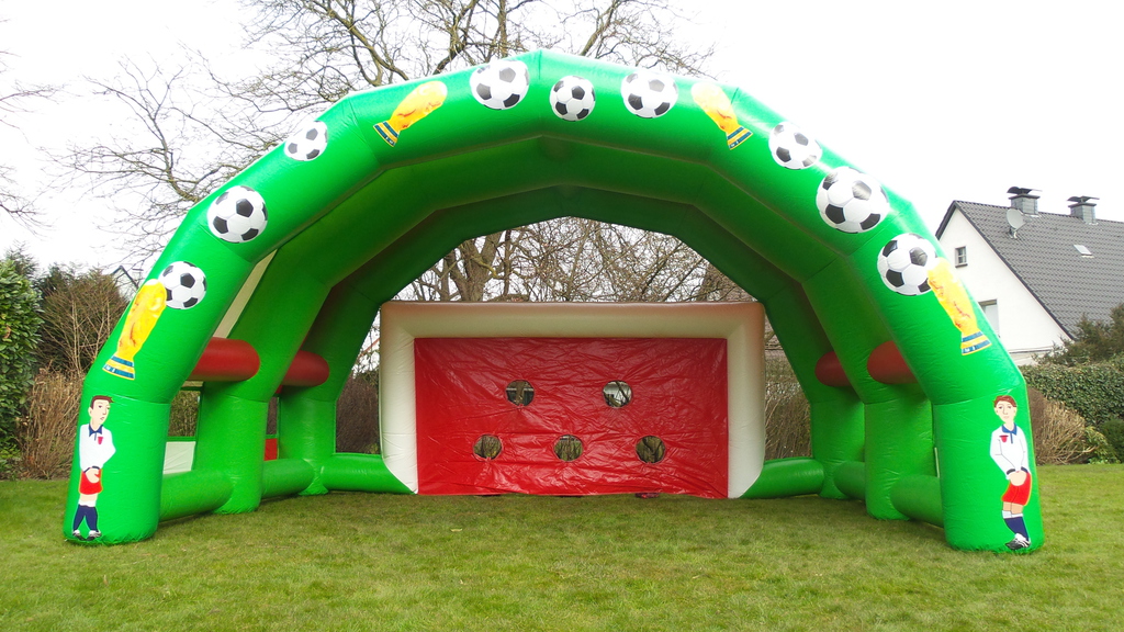 Die aufblasbare Riesentorwand wird gerne als Ergänzung zu einer Hüpfburg/ zur Riesenrutsche genutzt. Sie kann aber auch einzeln ausgeliehen werden. Sie besitzt ein großes Dach und könnte somit als (zusätzliche) Überdachung auf Ihrer Veranstaltung genutzt werden.